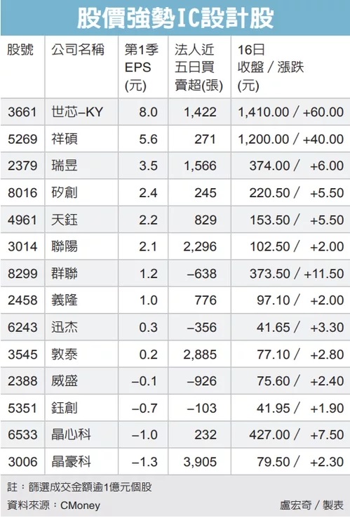 世芯-KY第1季EPS 8.09元,法人看好北美委託設計需求穩定,第2季相關業務回升將帶動毛利率回溫,近日股價沿5日線一路走高,迅杰、祥碩、聯陽等個股技術面姿態亦相當高。