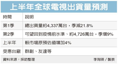 科技市調機構集邦科技(TrendForce)昨(16)日發布最新報告指出,受惠大陸電視品牌積極拉貨,本季全球電視出貨量將回到疫情前水準,並推升上半年總出貨量較該機構原預估值增加4%。法人解讀,這意味電視面板出貨同步優於預期,友達(2409)、群創跟著旺。