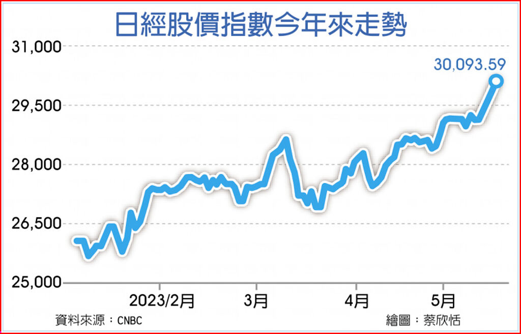 在觀光業復甦拉抬下,日本今年首季國內生產毛額(GDP)季增年率達1.6%,這不僅是三季以來首度正成長,同時也超越美國同期成長率1.1%。經濟成長開高,日股應聲大漲,日經225指數17日衝破3萬點關卡,為2021年9月以來首見。