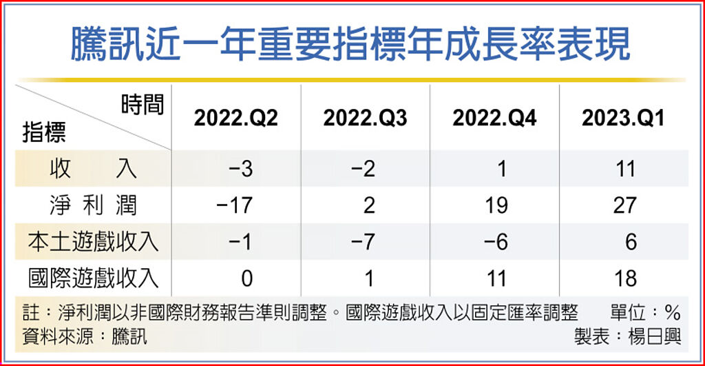 綜合港媒報導,騰訊17日盤後公布2023年第一季業績顯示,期間營收年增11%逼近人民幣(下同)1,500億元。毛利年增19%近682億元。淨利年增10%逾258億元,經調整淨利年增27%逾325億元。