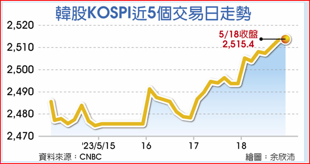 美債限危機可望解套帶動美股收高,激勵亞股18日普遍上漲,韓國大盤綜合股價指數(KOSPI)收漲0.83%或20.74點至2,515.4點,創5月2日以來新高。三星電子大漲1.85%,樂金電子勁揚1%。新韓證券指出,韓股小幅反彈主因除了美股大漲外,還有外資連續第三天買超,尤其是買進大型權值股。 |