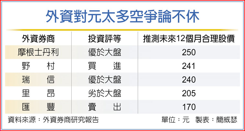 元太過去一段時間以來屢屢引起法人多空爭論,外資對前景看法也是南轅北轍,匯豐證券自3月初評以來便提醒成長性趨緩風險,給予「賣出」投資評等,加上里昂證券最新轉投保守派陣營、將推測合理股價降至205元,暫時難見到市場一面倒看多元太的高度共識。