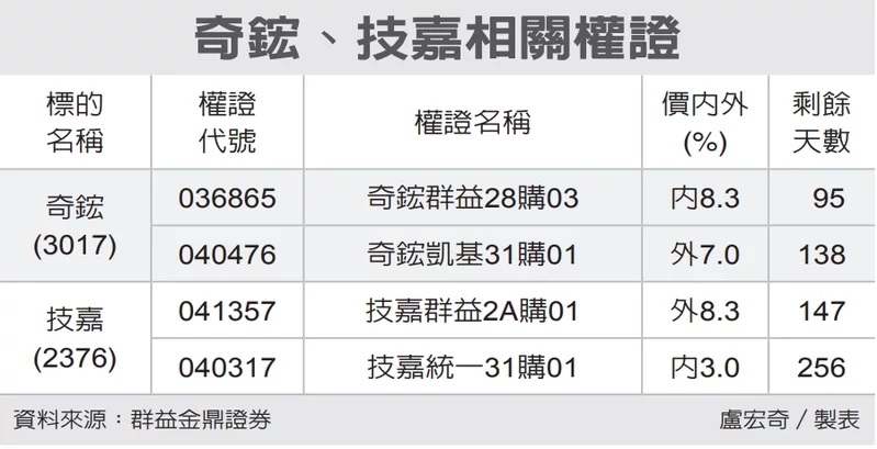 美科技股走強,台股昨(18)日量價齊揚,衝上萬六關卡,盤面題材股各自表態,奇鋐(3017)、技嘉(2376)與大盤同步改寫波段高點,後市仍有可為,發行券商建議,偏多投資人可透過權證的槓桿效果,擴大短線獲利空間。