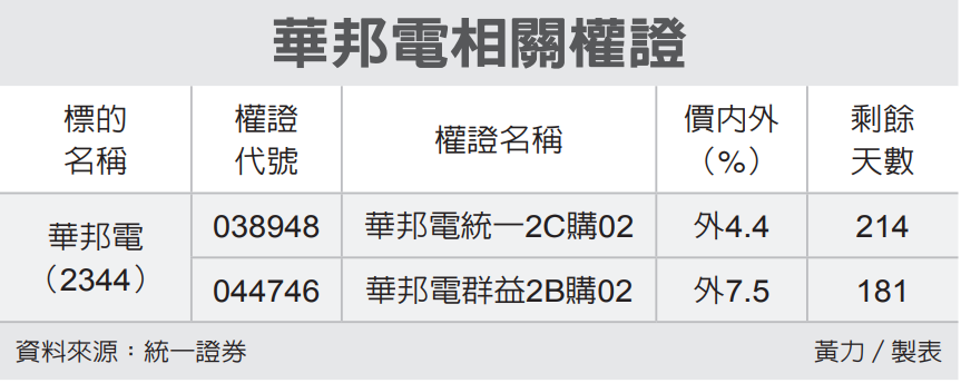 若看好華邦電後市表現的投資人,可挑距離到期日150天以上、價內外10%以內的相關認購權證,並設好停利停損點。(統一證券提供) |