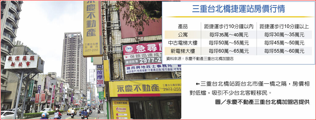 三重台北橋站距台北市僅一橋之隔,房價卻僅是台北市大同區的三分之二,由於進出台北市的交通便捷、區域生活機能成熟,新屋6字頭、公寓3字頭的房價水準,吸引不少台北上班族的輕移民,和台北退休族移居。