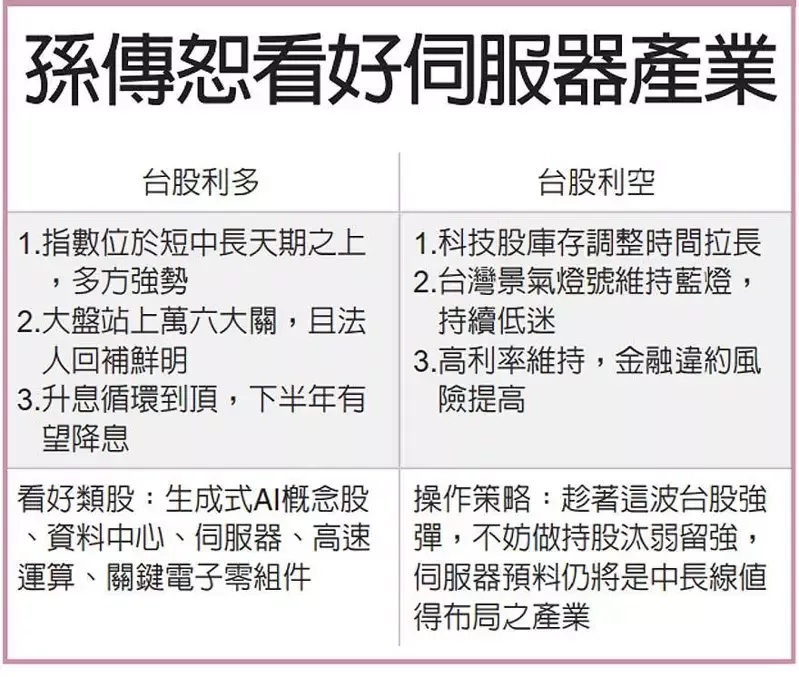 趁這波台股強彈,不妨持股汰弱留強,伺服器預料仍將是中長線值得布局產業,看好伺服器市場在資料流量持續增加下,帶動整體資料中心需求,並受惠導入生成式AI的資本支出增加,有利今年伺服器市場年增幅。