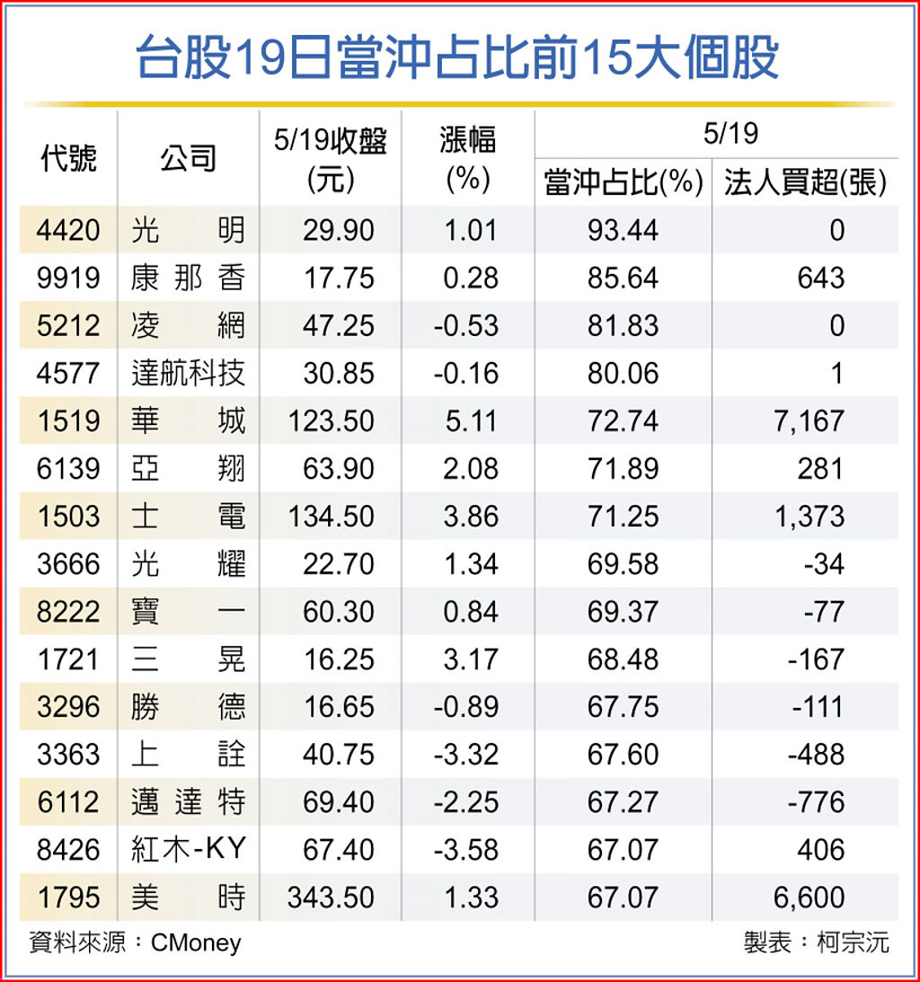 如從個股角度,統計19日當沖占比逾六成的個股高達39檔,前15名分別為光明、康那香、淩網、達航科技、華城、亞翔、士電、光耀、寶一、三晃、勝德、上詮、邁達特、紅木-KY、美時;其中光明當沖比重高達93.44%,位居台股當沖占比榜首。上述當沖個股中,康那香、達航科技、華城、亞翔、士電、紅木-KY、美時等,19日皆獲法人買超。