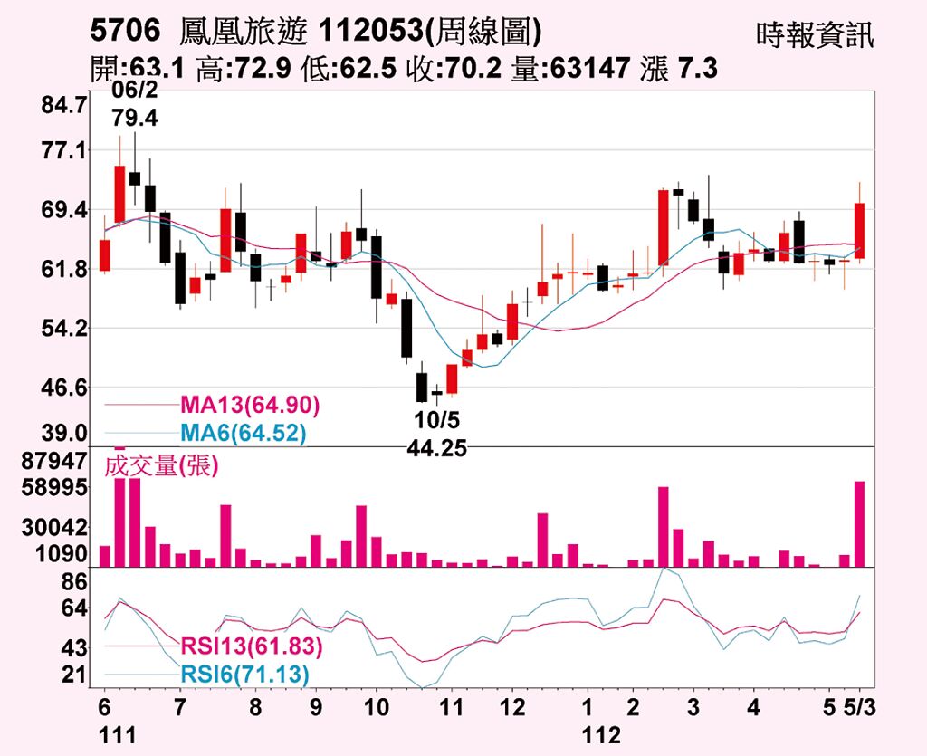 鳳凰旅行社(5706)股價19日開低後一度下跌2.5%,隨後在兩岸旅遊有望解凍消息激勵下急拉翻紅,最高勁揚7.36%至72.9元,終場上漲3.39%、收於70.2元,為2月中以來近3月高點,成交量倍增至1萬6,250張。本周合計上漲11.61%,周線連二紅。三大法人近日持續加碼,19日買超189張,本周合計買超達1,900張。