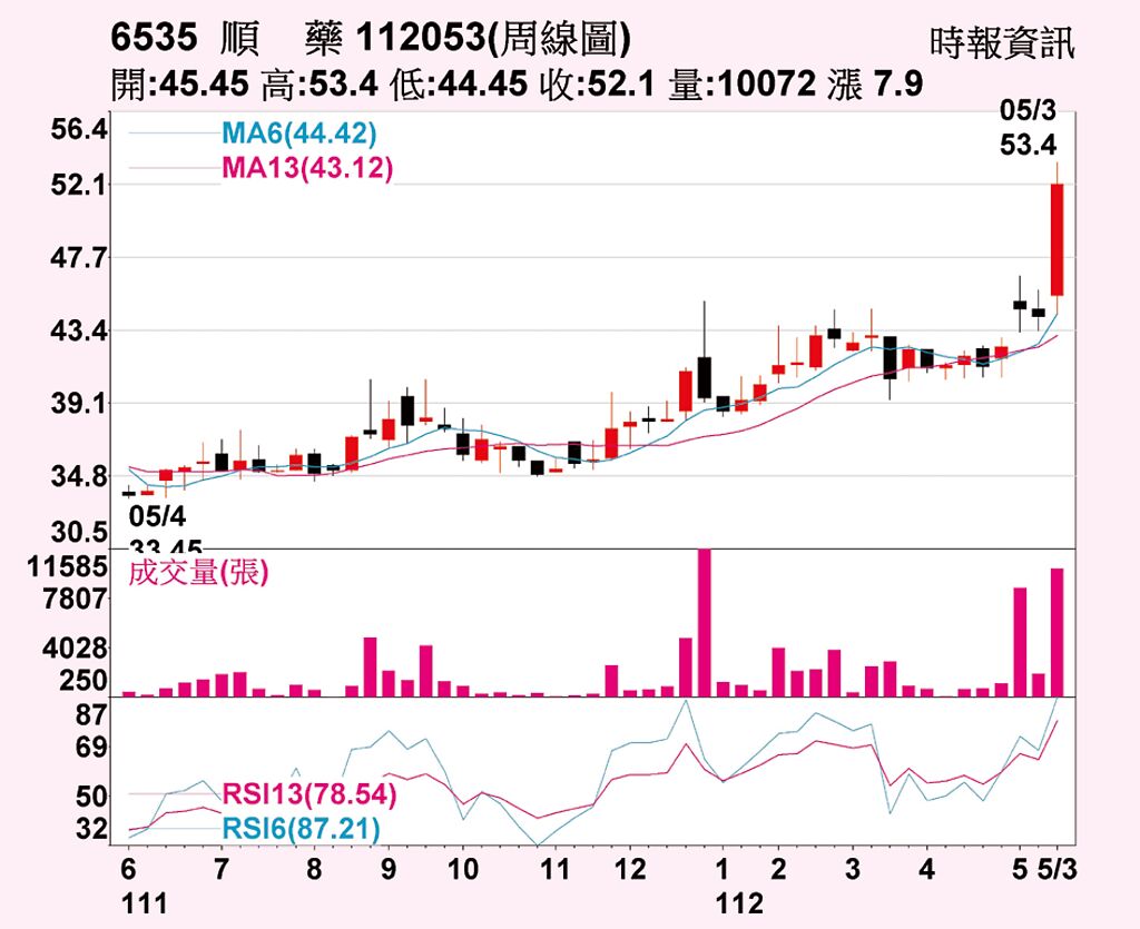 順藥(6535)挾著長效止痛劑LT1001獲得烏克蘭藥證主管機關SMDC核準取得進口藥品上市許可藥證,拿下第一張歐洲市場入門票,預期將有助於未來業績成長,帶動股價連漲多日,5日漲幅達17.9%,19日以52.1元作收,改寫兩年新高。