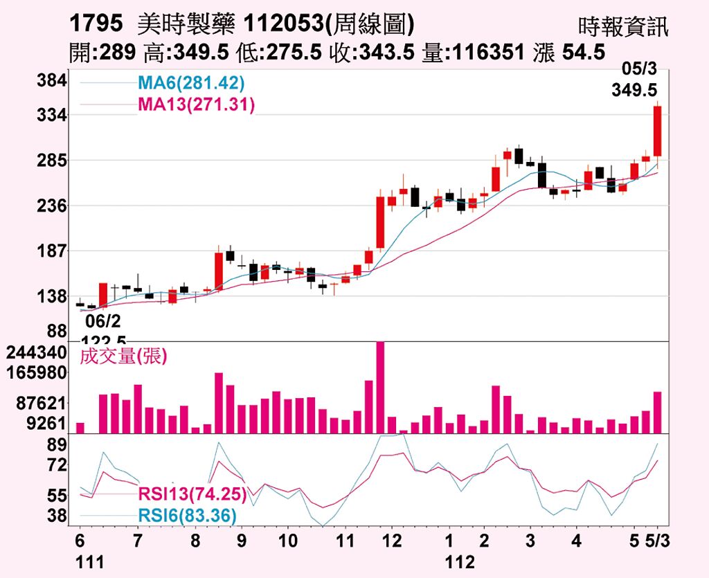 美時(1795)受惠高毛利產品挹注,第二季毛利率有望維持近60%高檔,加上肺癌學名藥Nintedanib有望本季認列授權里程碑金,法人看好營運仍可延續成長動能中,激勵連日股價強漲,5日漲幅達18.9%,19日盤中以349.5元創下歷史新天價,成交量再放大至37,104張。