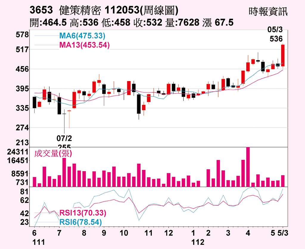 健策(3653)去年獲利暴衝,累計稅後純益26.14億元,年增超過一倍,且創下歷史新高,每股稅後純益高達19.54元,今年走勢緩步盤堅,而首季財報EPS 3.63元,與去年同期3.8元相比小減不到5%,再度帶動市場對全年展望的樂觀預期,本周逐日放量強攻,推升股價最高來到536元,周漲幅逾14%。