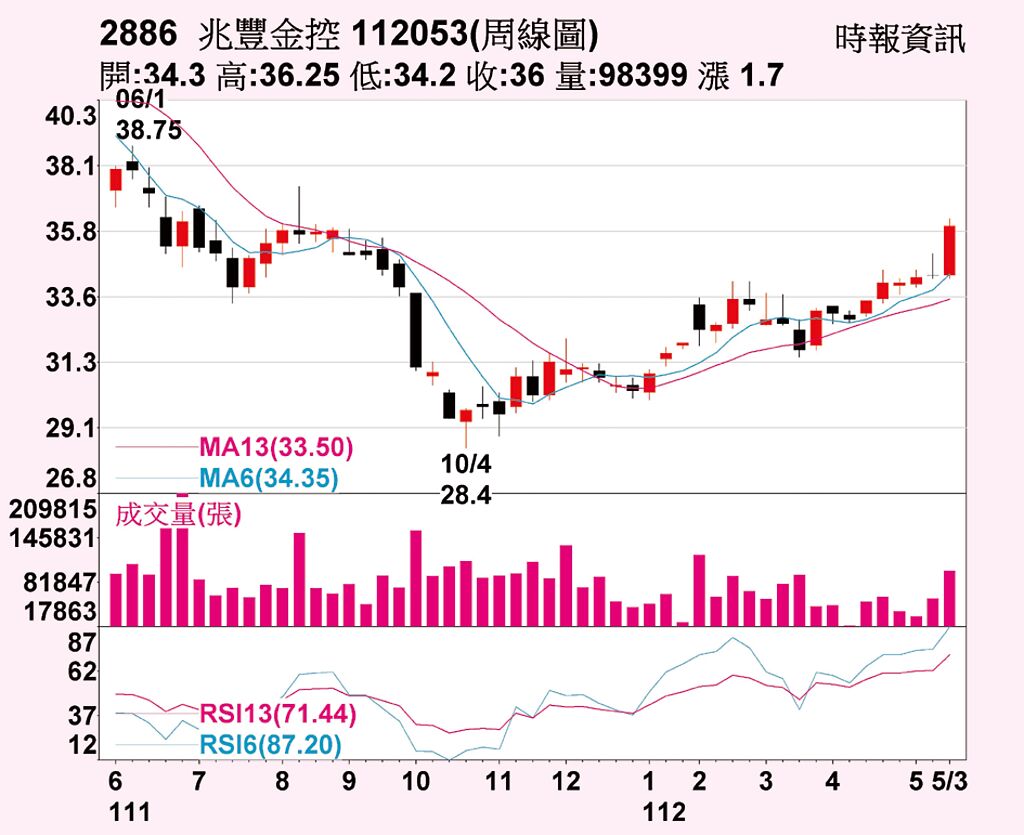 三大法人進出方面,外資買超12,346張、投信買超1,937張、自營商買超13,803張。技術線型觀察,兆豐金現在位於周線、月線、季線上,兆豐金19日收在36元,整周股價上漲1.7元、4.96%。