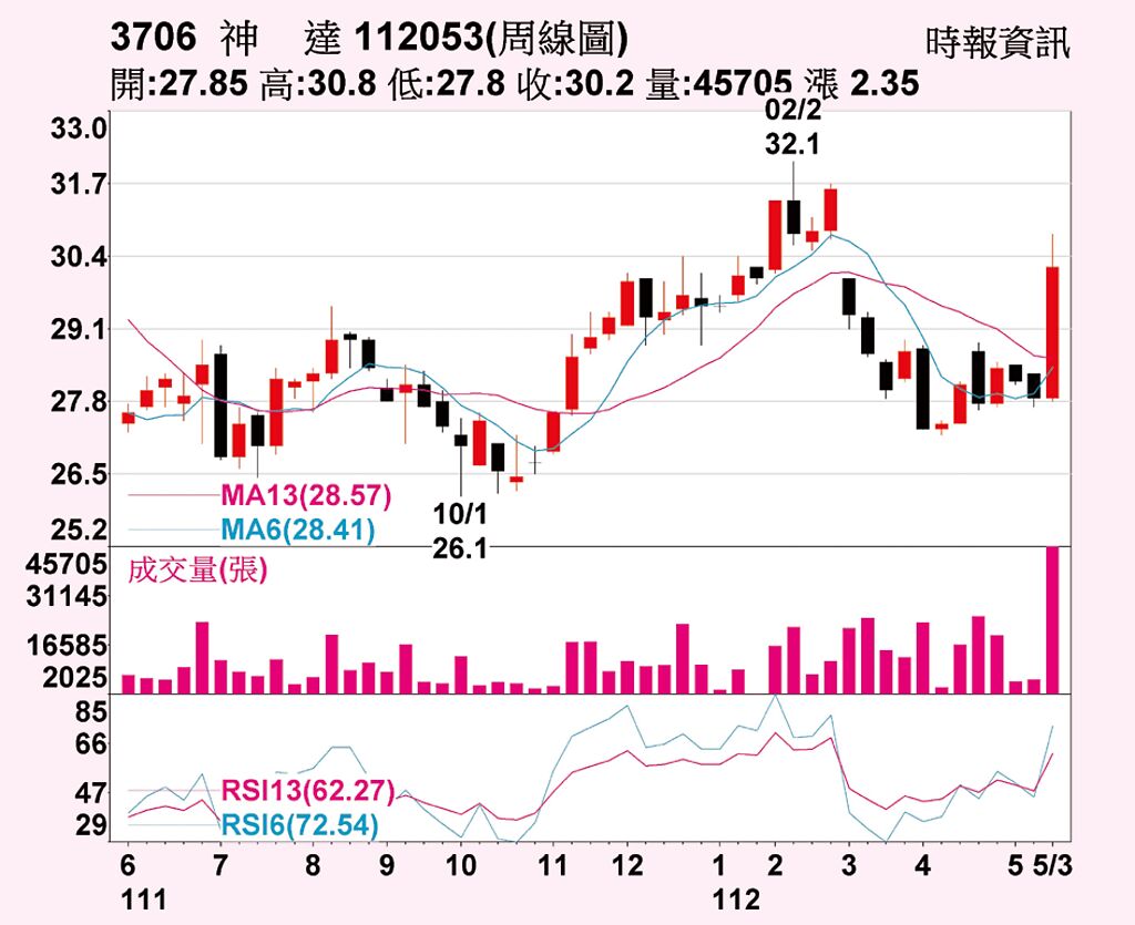 神達(3706)4月營收年增22.13%,達到37.05億元,加上第一季財報稅後純益1.52億元,季減轉為季增,每股稅後純益(EPS)從去年第四季虧損0.29元,轉為第一季獲利0.13元。法人估計,營運可望於第一季落底,第二季可望觸底反彈,看好下半年業績,帶動股價飆升。