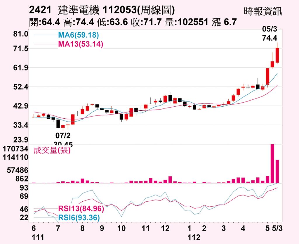 建準(2421)首季財報報喜,再加上法說會24日登場在即,市場看好建準前景,預期法說會應會釋出利多,推升法說會行情先行啟航,19日早盤一度衝高至74.4元,再創波段新高,雖然尾盤漲幅收歛,以71.7元作收,收漲5.13%,但周漲幅仍受帶動,達10.3%。