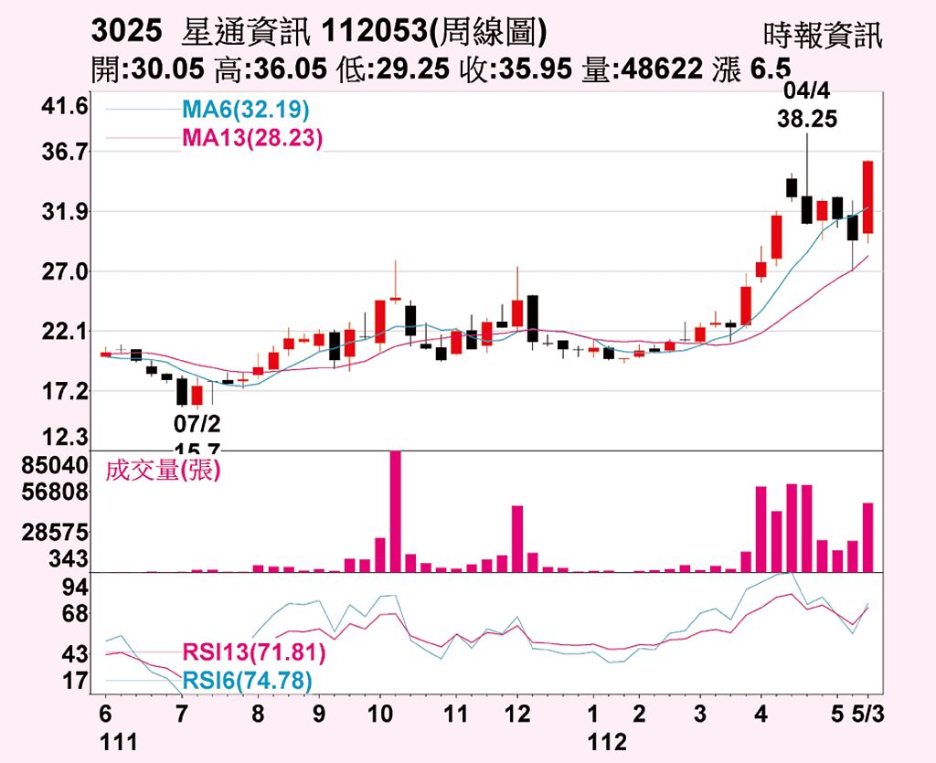 星通(3025)首季獲利亮眼EPS 0.61元,達成去年全年EPS 0.95元的逾六成,在基本面掛保證下,股價近期漲勢淩厲,周線一紅吃二黑,19日以35.95元、上漲9.6%作收,推升周漲幅放大至22.1%,大有問鼎波段高點38.25元的氣勢。