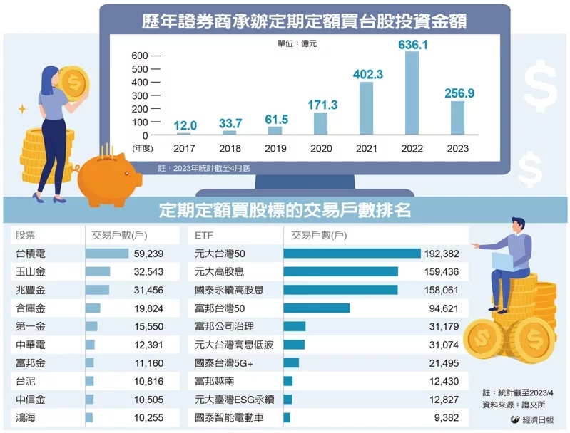 證交所統計,截至去年7月,定期定額買台股累計投資金額正式突破1,000億元關卡,今年4月底進一步攀升至1,574.1億元,自去年3月以後單月投資金額穩定維持50億元以上高檔不墜,證券商樂觀預期今年底累計規模將上看2,000億元,再締新里程碑。