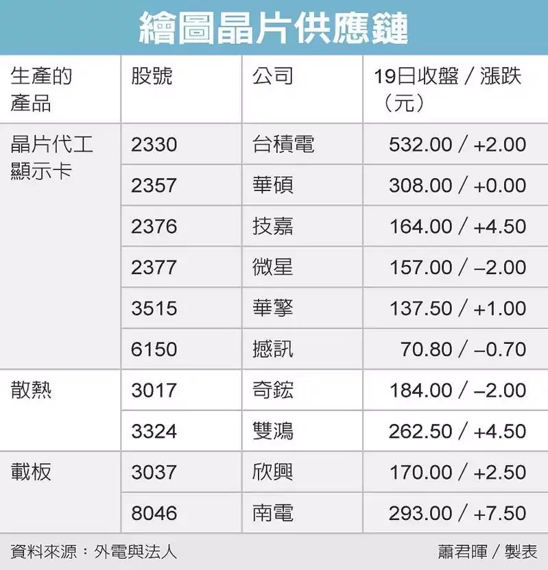 輝達(Nvidia)與超微(AMD)兩大繪圖晶片廠將推出新一代繪圖晶片,可望帶動晶片代工廠台積電,顯示卡廠微星、技嘉、華碩、華擎、撼訊,散熱廠雙鴻、奇鋐,載板的欣興、南電等,均可望受惠,有助推升下半年業績。