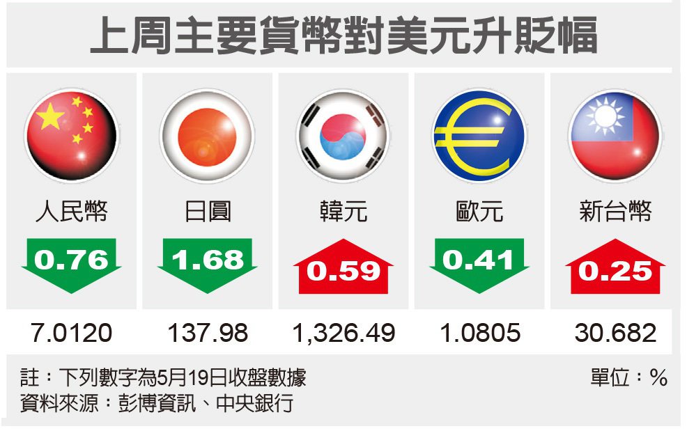 熱錢上周五(19日)大舉匯入約8億美元,激勵新台幣匯率盤中一度升值逾1角,終場收30.682元。統計新台幣匯率上周累計升值7.6分,升幅0.25%。