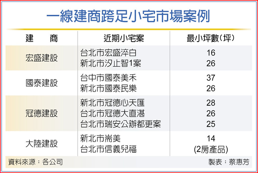 房市轉向總價市場,小宅戰局也愈來愈燒,連豪宅建商宏盛建設,也首度跨足精品小宅市場,震撼市場;國泰、冠德、大陸等一線建商,更競相投入小坪數住宅市場。