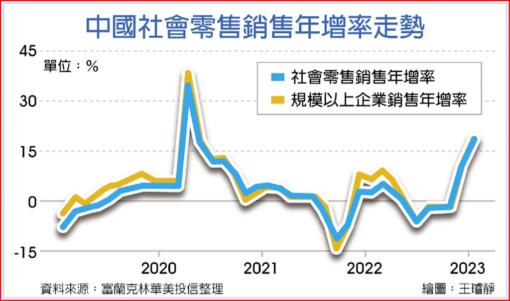 富蘭克林華美中國A股基金經理人沈宏達表示,觀察大陸4月以來陸續公布的重要經濟數據結果得出,投資領域的指標持續走弱,但消費則是穩定走揚;如4月底中央政治局會議要點,先前供給遭受衝擊、需求疲軟等壓力緩解,預期國內經濟復甦力道持續好轉。