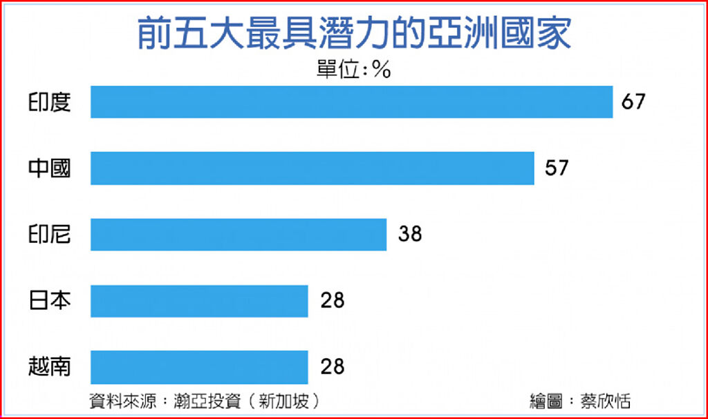 根據瀚亞投資攜手PwC新加坡公布的「亞洲2.0:投資於新機遇時代」白皮書,亞洲對全球經濟發揮日益重要的作用,到2030年亞洲將占全球生產總值40%以上,及全球出口的42%。全球百位企業領袖調查結果顯示,67%認為印度潛力最大,其次為大陸的57%及印尼38%。