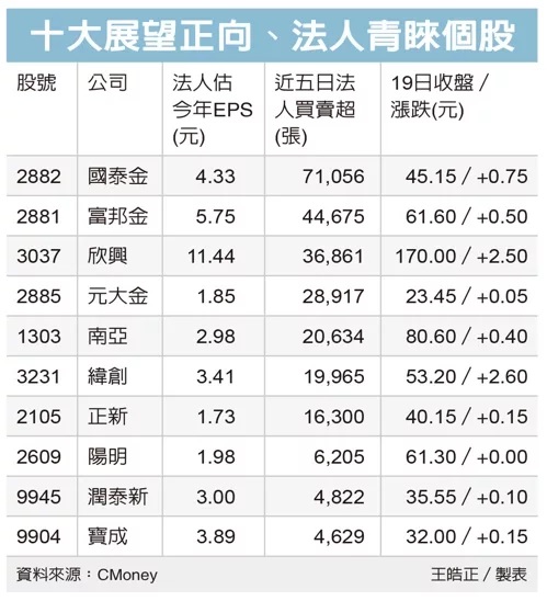 例如國泰金(2882)、富邦金、欣興、元大金、南亞、緯創、正新、陽明、潤泰新、寶成等,近五個交易日法人買超逾4,000張,且今年全年法人預估的每股稅後純益(EPS)將有機會超過1.5元。