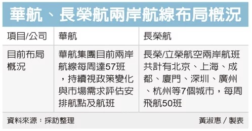 航班方面,華航目前兩岸航線每周達57班,並持續視政策變化與市場需求評估安排航點及航班。長榮/立榮航空目前兩岸航班共計有北京、上海、成都、廈門、深圳、廣州、杭州等七個城市,每周飛航50班。