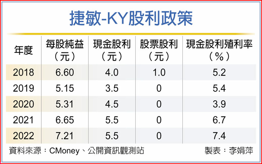 捷敏-KY 2022年稅後純益9.30億元,每股稅後純益(EPS)7.21元,董事會決定配發5.5元現金股利,配息率約76%,以隱含殖利率來看,也超過7%。今年第一季稅後純益1.599億元,EPS 1.24元。