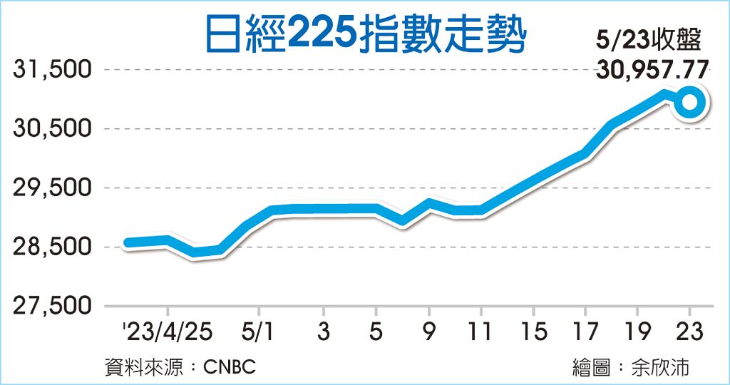 日經225指數23日開盤後攻上31,352點創33年新高後,就出現獲利回吐賣壓而翻黑,下跌0.4%收30,957點,終止之前連續八個交易日收紅的漲勢,其中豐田汽車股價大跌近5%,為日經成分股跌幅最大個股。但三井住友DS資產管理策略師市川雅弘仍預期,指數年底上看33,500點。