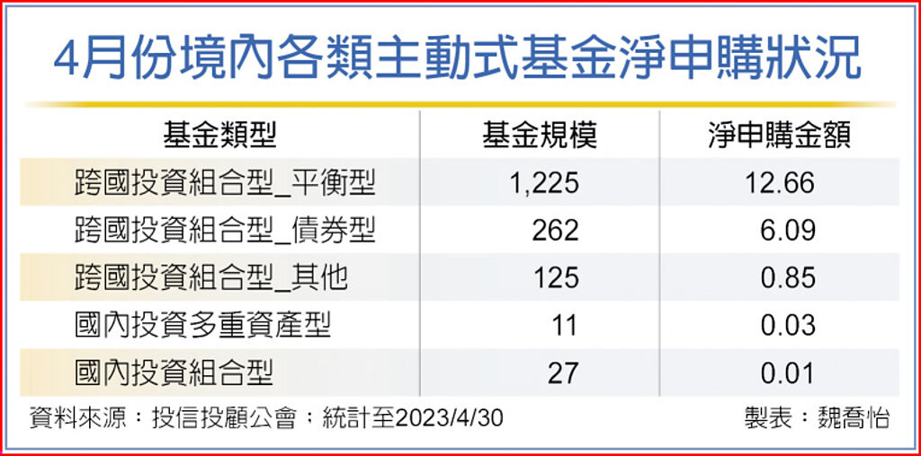 全球市場在第一季強勢反彈後4月拉回,受趨避氛圍的影響,資產配置的組合基金相對吸睛,據投信投顧公會統計至今年4月底,平衡型組合基金以淨申購12.66億元居冠,其次是債券型組合基金的淨申購6.09億元。