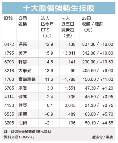 昨日上市生技類股漲幅1.4%,僅次於造紙、觀光類股的2.9%、1.8%,多頭格局未變,量大指標股包括佰研、順藥、寶齡富錦、軒郁、美時、永信、大學光等漲幅達2.2%至9.9%不等。