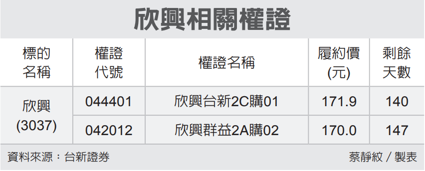 權證發行商表示,看好欣興後市的投資人,可挑選價內外15%以內的中長天期權證,參與個股行情。(台新證券提供)