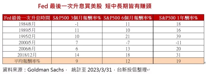 台新投信表示,在美國政府強力且迅速的介入下,市場逐漸自矽谷銀行與瑞信事件中回穩,Fed(美國聯準會)觀察重心從金融穩定移轉至通膨與就業數據。考量近期美國就業與製造業、服務業數據走弱,通膨有機會進一步下降,分析師普遍預估聯準會將在6月停止升息。根據歷史經驗,在 Fed 最後一次升息買美股 短中長期皆有賺頭,布局 S&P500指數一年平均報酬率近二成,現在正是布局美股良機。在破壞式創新引領科技業爆發性成長下,智慧生活基金後市看俏,可優先布局。