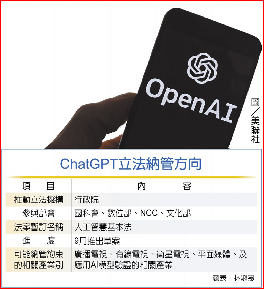 ChatGPT等生成式AI(人工智慧)掀起全球熱潮,但亦引發著作權、事實查證及倫理等無法可管等問題,NCC於24日透露,行政院已召開跨部會會議,將邀集國科會、數位部、NCC及文化部等相關單位,針對ChatGPT等生成式AI立法納管研議出爐一部「人工智慧基本法」,立法規範納管。