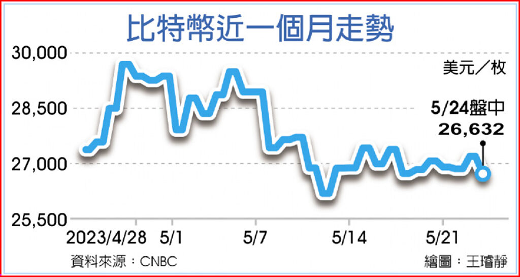 比特幣23日一度收復2.7萬美元,但為時短暫,24日再度壓回,跌幅超過2%,報26,632美元。比特幣上個月還衝破3萬美元大關,但近來受到美債限談判卡關與資金流向股市影響,市場交投清淡不少,量能若未見回溫,不利後市發展。分析師表示,投資人一方面擔心債限問題,另一方面資金有流向股市的趨勢,造成比特幣陷入盤整。 |