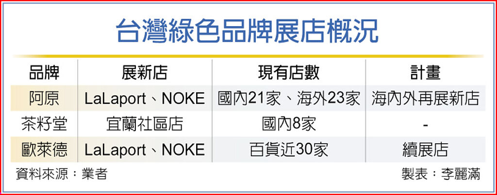 也因為綠色百貨商場掘起,使得台灣本土深耕已久的綠色品牌瞬間變得火熱,無論是日系、還是本土百貨商場均積極邀約進櫃;其中包括阿原肥皂在上半年進駐台中三井LaLaport、大直忠泰NOKE等,累計全台21店。根據百貨通路業者指出,阿原肥皂是海外觀光客鍾愛指定的台灣品牌伴手禮,目前在日本也有7個海外販售據點,就連日本北海道知名伴手禮「白色戀人」董事長石永創,近期來台亦特別到永康店採購,引進台灣品牌除了綠色品牌延續永續概念,亦準備疫後迎來國際觀光客商機。