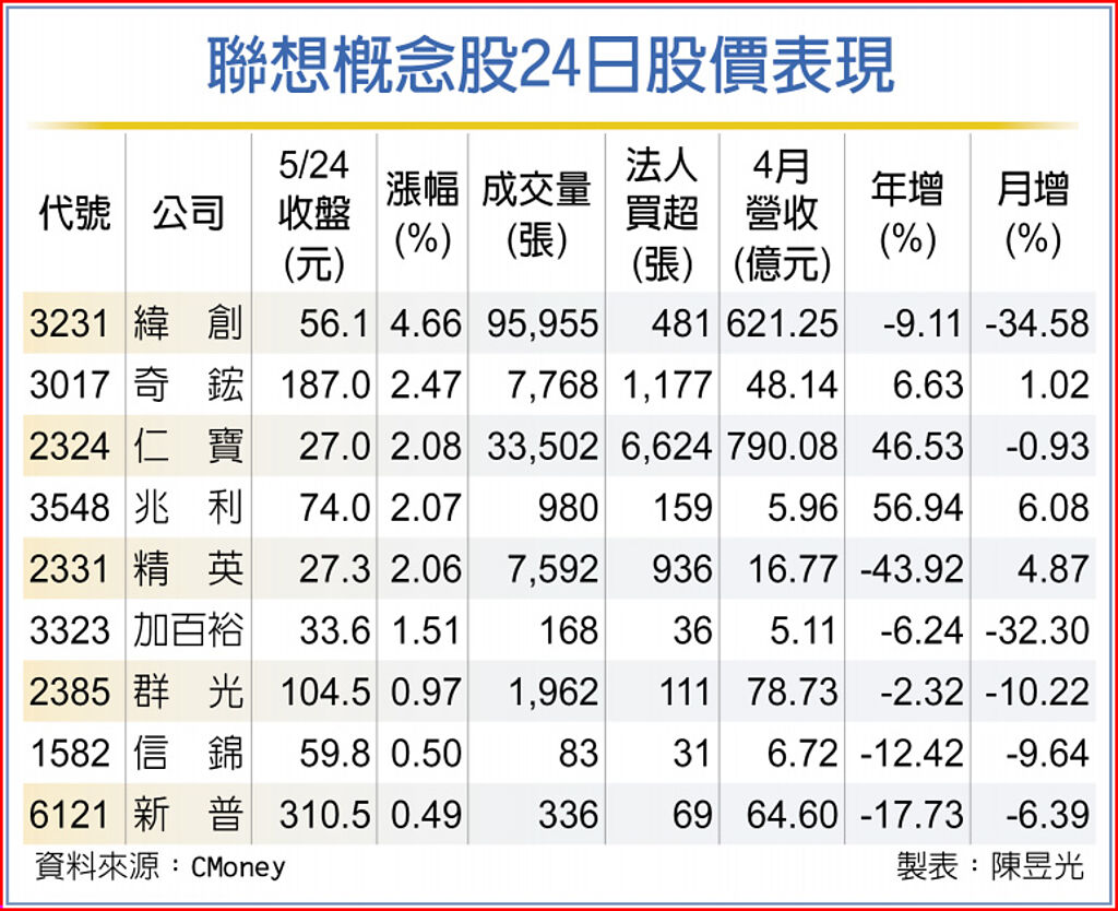 而聯想概念股中,奇鋐、兆利、精英等24日同步獲得法人買盤敲進,股價同步收漲逾2%,表現強過大盤。 |