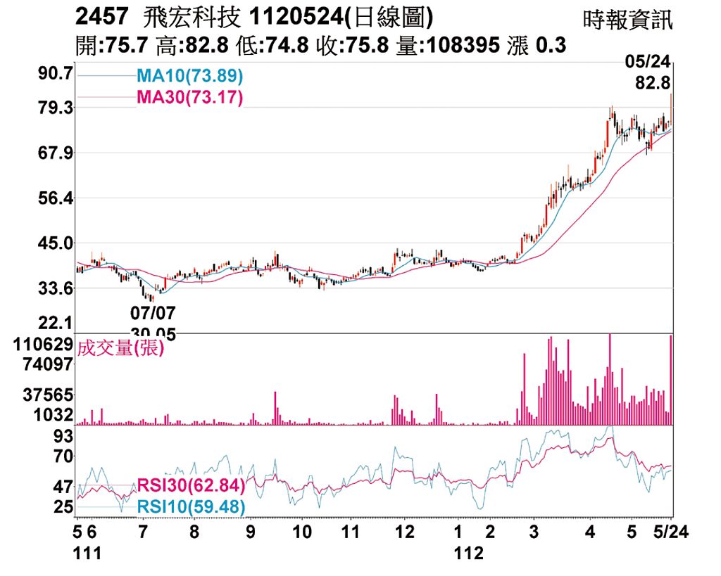 外資22及23日進場大買,買超張數高掛2,430及4,828張,散戶大軍23日也積極搶進,盤中一度來到82.8元,與漲停價83元只有0.2元差距,不料當日外資竟反手賣出,將前二日買進籌碼一口氣全倒出,出現6,695張賣超,飛宏股價應聲由逼近漲停殺回到平盤附近,僅以小漲0.3元的75.8元作收,徒留盤中創高的英姿。 |