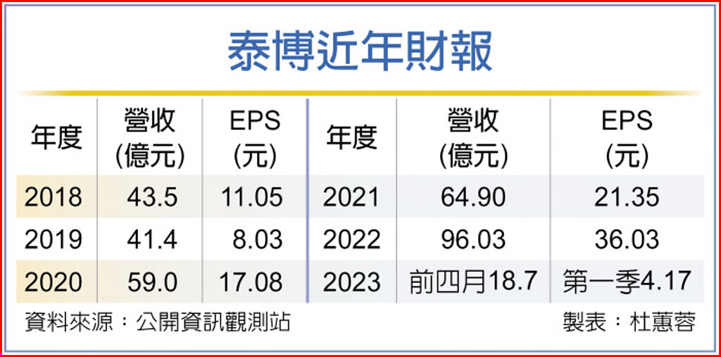 泰博去年EPS飆上36.03元新高,穩坐生技股EPS王寶座,24日股東會通過配發現金股息20元。泰博今年第一季EPS也交出4.17元佳績,法人看好全年可賺逾1股本。由於目前滿手現金約30億元,若含子公司則高達40億~50億元,除了6,000多萬美元的現金定存,每個月貢獻利息達700萬~800萬元外,也將進行跨領域的投資,為未來營運添加動能。
