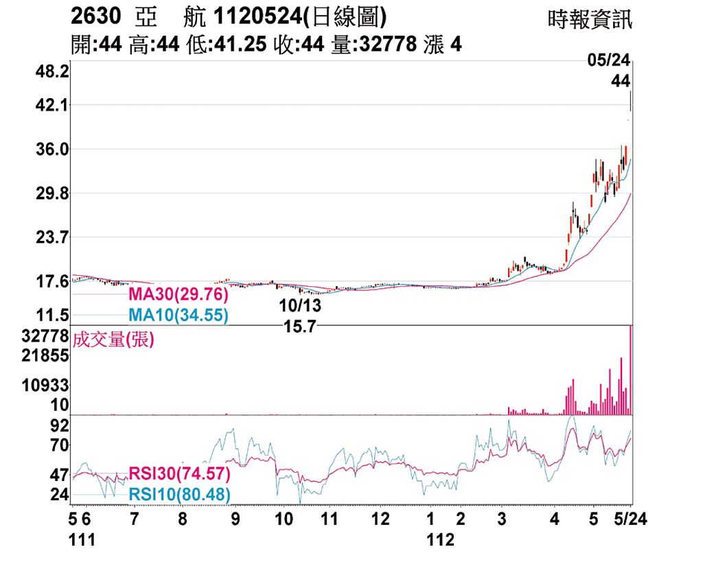 亞航(2630)24日開高走低,盤中震盪整理,外資與主力力挺下,10時2分直攻漲停鎖死至終場,收44元、上漲4元,連三漲,成交爆量逾3.27萬張,站上各均線。外資24日買超324張,近五日累計買超506張,自營商累計買超40張,外資持股比0.65%,三大法人持股比0.88%。