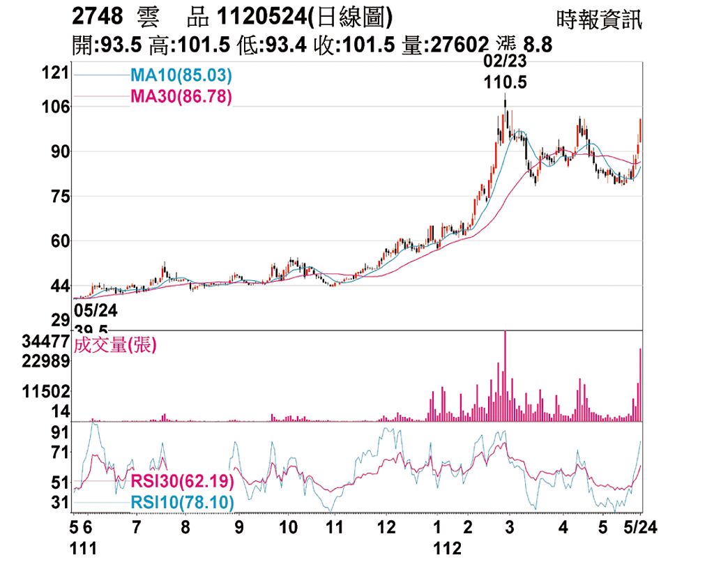 雲品(2748)股價24日開高後獲買盤敲進,放量直攻漲停價101.5元,創2月中以來高點,成交量躍增至2.75萬張,亦創2月中以來大量,合計近七日已大漲28.6%。三大法人持續偏多操作,24日合計買超433張,本周迄今買超1,794張,其中以投信買超1,997張最多、外資買超179張,自營商賣超149張。