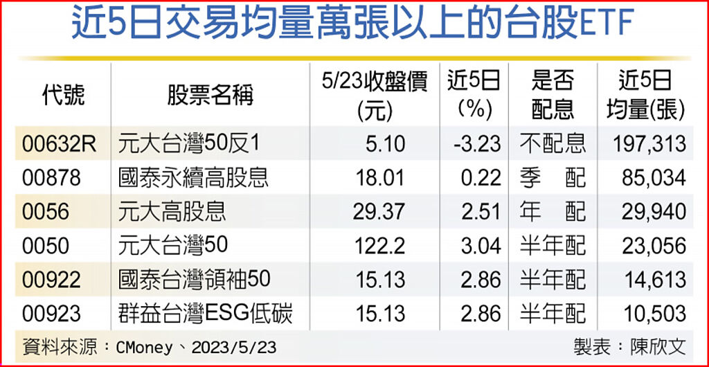 投資台股要能抵禦金融市場的波動度,配置中不可或缺的即是台股ETF,從成交量來看,台股ETF交投熱度不減,48檔台股ETF近5日成交均量上萬張的有6檔,分別是元大台灣50反1、國泰永續高股息、元大高股息、元大台灣50、國泰台灣領袖50、群益台灣ESG低碳。整體來看,除了1檔反1ETF外,4檔是高息,另有一檔則是ESG低碳主題ETF。