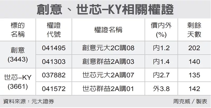 若看好創意、世芯-KY後市表現,可選擇價內外5%以內、距到期日120天以上權證入手。 |