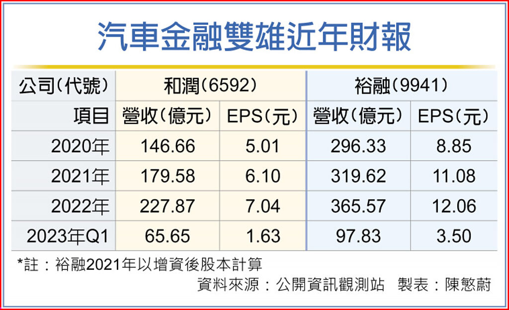 和潤第一季營收65.64億元,年增26.62%,每股純益1.63元;裕融第一季營收97.8億元,年增16.3%,每股純益3.5元。 |