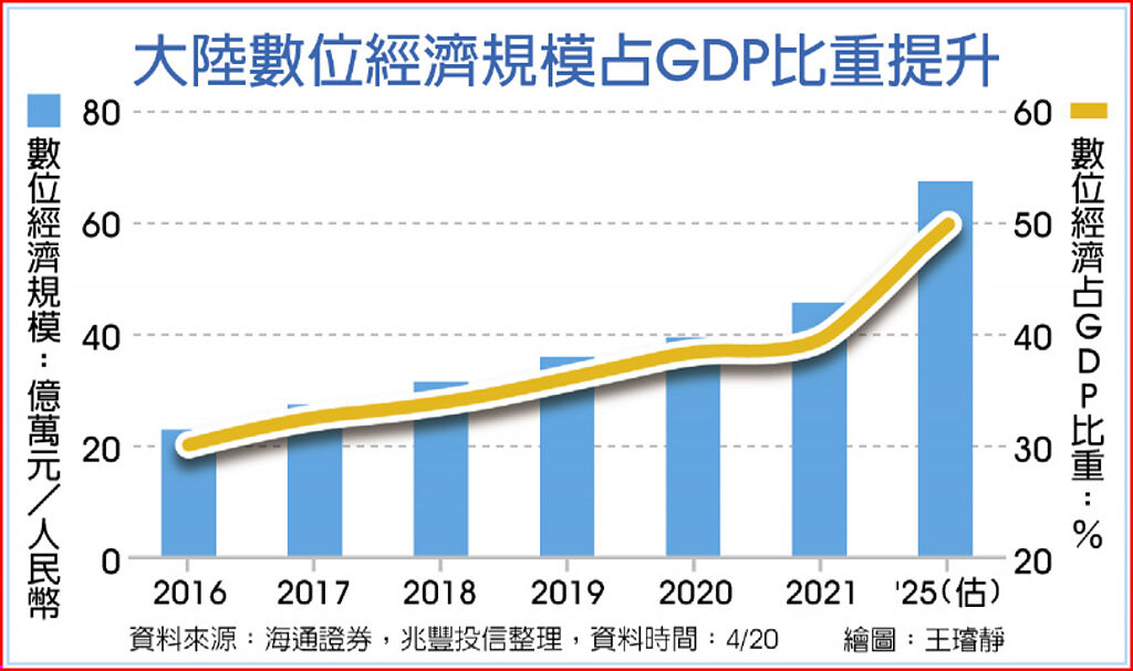 隨中國大陸政府各項穩定成長,預期可帶動大陸經濟穩步回升,大陸科技創新是重要動力,大陸的人口紅利、雄厚資源與技術等條件優勢以外,更加仰賴科技創新,大陸官方不斷增強對科技產業的推動力度,並適時掌握政策風向,AI話題火熱帶動相關類股,資金挹注TMT領域,硬體、軟體等供應商受惠,成為近期投資熱點,往後也是數位經濟發展重點。
