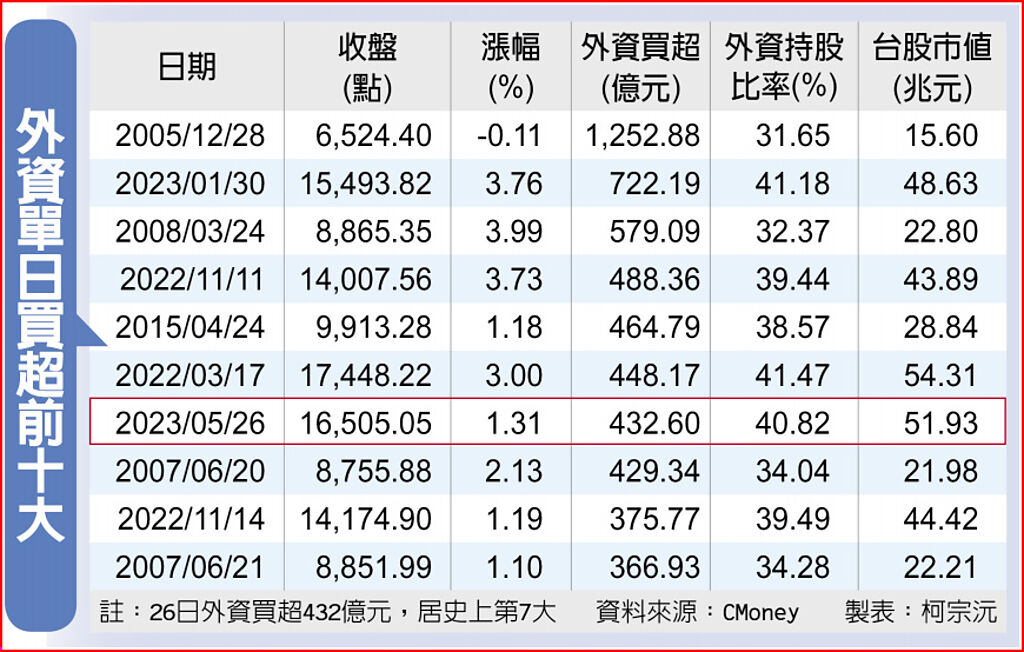 輝達(Nvidia)與台積電大漲外溢效應,台股展開本益比(PE)調升行情,外資26日大舉買超432.6億元,為史上第七大買超水準,加上電子股滿血復活,成交值比重衝上72%創16個半月新高,以及權王台積電衝破三重頂反壓,聯袂推升指數大漲飛越16,500點。