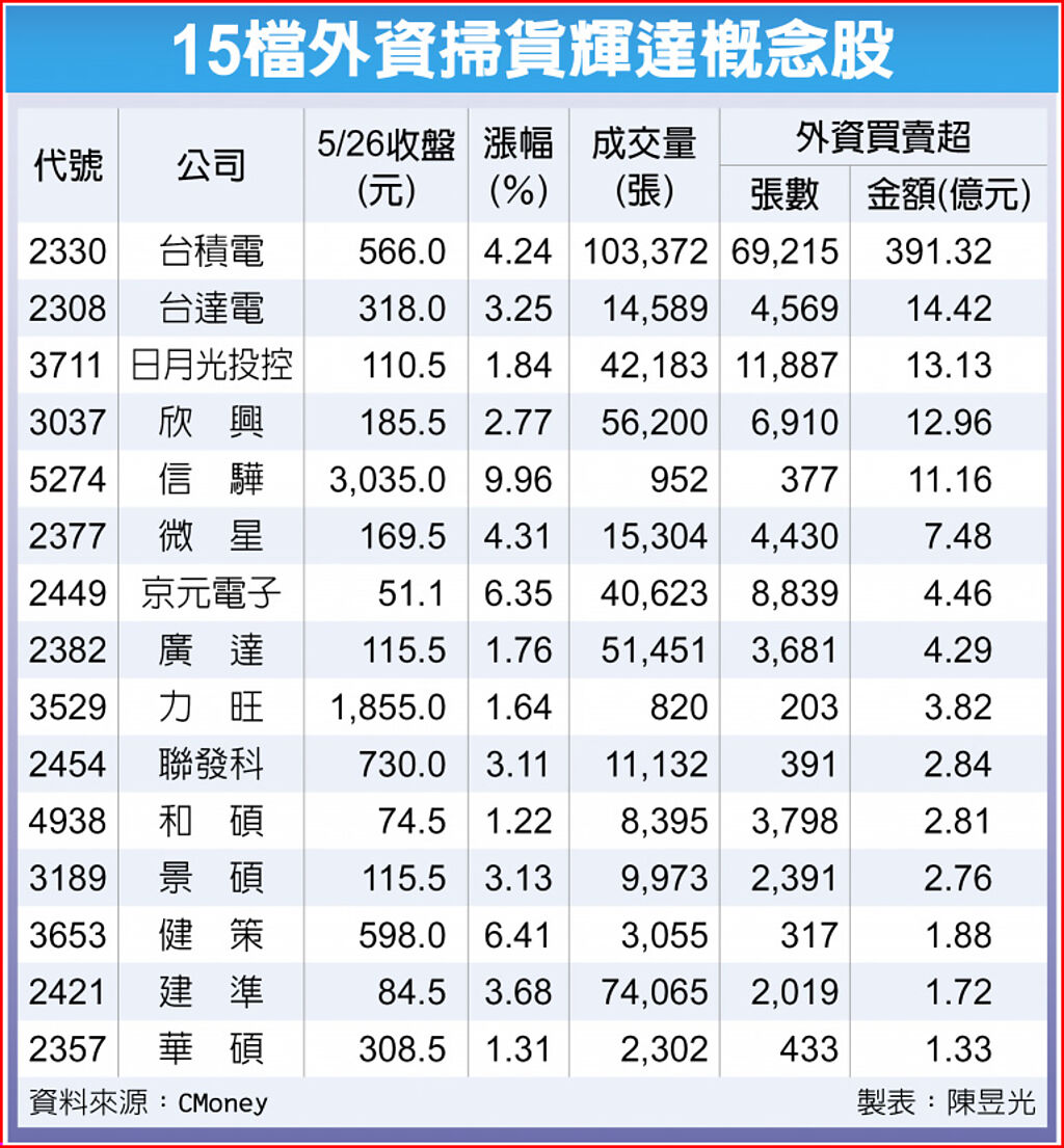 據統計,台股共有台積電、台達電、日月光投控、欣興、信驊、微星、京元電子、廣達、力旺、聯發科、和碩、景碩、健策、建準、華碩等15檔輝達概念股,符合26日外資大舉掃貨,加碼金額達億元水準,且股價站穩各期均線之上,有助多方力道續航。
