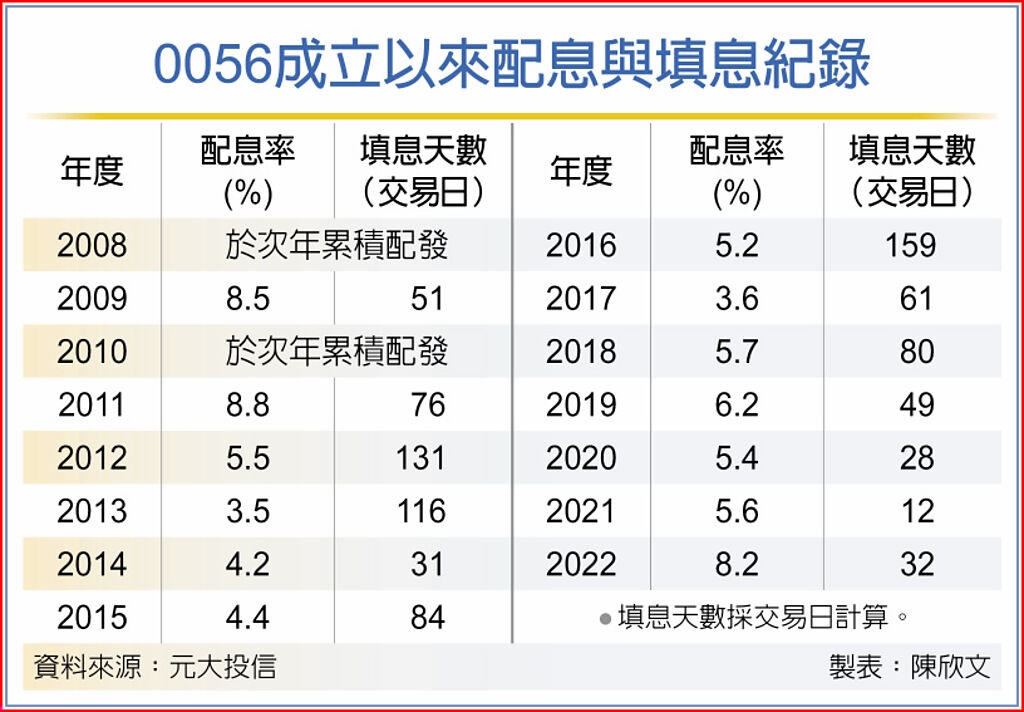 元大投信指出,0056長期配息且填息表現優異,促成存股領息風潮,以往每年除息前後更有「0056現象」,包括參加除息尋求高配息率的「愈配愈買」、除息後以較低成本增持的「配完再買」,甚至是單純瞄準填息價差的「配完才買」,都能透過0056建立投資策略,在正式改為季配後,更可以季季參與。