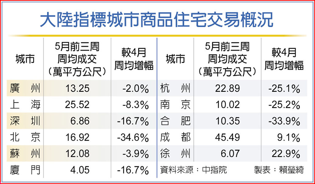 綜合陸媒26日報導,中指院數據顯示,5月前三周(至22日),重點50城商品住宅周均成交434萬平方公尺,較4月周均下降17.7%,較去年同期增17.9%。
