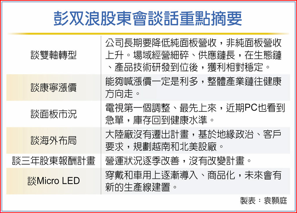 友達(2409)舉行股東常會,通過去年財報和股利政策。玻璃基板廠康寧宣布漲價,以及三年股東報酬計畫都是股東關心的話題。董事長彭雙浪表示,康寧既然能夠喊漲價一定是利多,看到整體產業鏈往健康方向走。另外,在平衡營運資金和股東報酬之下,今年以資本公積發放0.8元,公司也希望未來能達到目標。